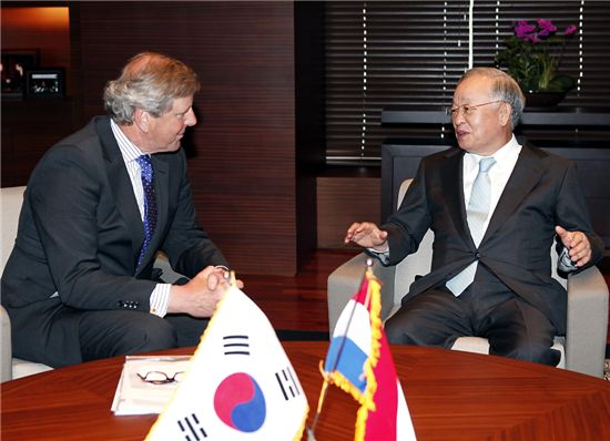 [아시아경제 이윤재 기자] 손경식 대한상공회의소 회장이 27일 대한상의회관에서 아게 풀루이트만(Age Fluitman) 네덜란드 암스테르담 상업회의소 회장을 만났다.대한상의는 이날 양국 상의 회장은 상호간의 역할을 강조하며 경제협력 증진방안을 논의했다고 밝혔다.아게 풀루이트만 암스테르담상의 회장은 “암스테르담은 금융·물류의 중심지로서 유럽시장 진출의 통로”임을 강조하며 “한-EU FTA도 성공적으로 타결된 만큼 한국기업들이 네덜란드에 대해 더 많은 관심을 가져줄 것”을 당부했다.이에 손 회장은 “네덜란드는 EU국가 중 한국에 가장 많은 투자를 하는 주요교역국이며, 세계적인 네덜란드 기업들이 한국 경제발전에 많은 기여를 해왔다”고 말했다. 이어 “양국의 경제협력 증대를 위해 양 상의간 교류가 더욱 활성화되기 바란다”고 덧붙였다. 이윤재 기자 gal-run@<ⓒ세계를 보는 창 경제를 보는 눈, 아시아경제(www.asiae.co.kr) 무단전재 배포금지>