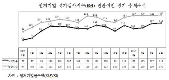 [아시아경제 오현길 기자]최근 경기가 회복세를 보임에 따라 벤처기업 경기도 최고 실적을 기록한 것으로 조사됐다. 내달 전망 역시 작년 초 조사 이래 최고치를 경신해 지속적으로 나아질 것으로 보인다.30일 벤처기업연구원이 조사한 4월 벤처기업 경기실사지수에 따르면, 경기실적이 118로 전월대비 1포인트 증가했다.이는 연구원이 작년 1월부터 조사를 시작한 이래 가장 높은 실적지수다.아울러 5월 전망지수 역시 140으로 전월 전망 대비 1포인트 상승해 최고치를 경신했다.이는 최근 국내 경제가 회복세에 접어들며 내수와 수출의 증가로 인한 것이라고 연구원측은 분석했다. 실제로 국내 여건은 전월대비 6포인트 상승한 115, 국외 여건도 111로 전월대비 3포인트 증가했다.또 수익성과 자금사정에서 각각 105와 97을 기록, 전월대비 3포인트, 6포인트 상승했다. 반면 부채는 104를 기록했던 전월보다 2포인트 감소한 것으로 집계됐다.4월 고용실적은 상시종업원수가 전월 대비 7p, 임시종업원수도 5p 상승, 각각 121, 112를 기록했다.소프트웨어개발 업종을 제외하고 전 업종이 기준치 100이상으로 나타났으며, 5월 전망도 4월 실적 대비 전업종이 큰 폭으로 호전될 것으로 조사됐다.이번 조사는 2008년 12월 말 기준 벤처확인기업 1만5401개를 업종 및 규모를 기준으로 표본을 배분, 21일부터 27일까지 온라인 BSI 조사시스템을 통해서 진행됐다. 100 이상인 경우에는 호전을, 100이하인 경우에는 악화를 뜻한다.오현길 기자 ohk0414@<ⓒ세계를 보는 창 경제를 보는 눈, 아시아경제(www.asiae.co.kr) 무단전재 배포금지>