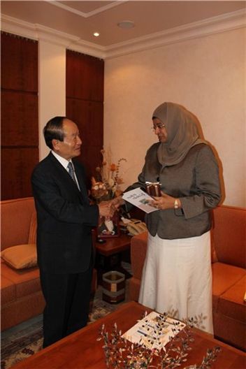 ▲ 오명 건국대 총장과 라우야 알 부사이디아(Rawya saud al busaidia, 사진 오른쪽) 고등교육부장관(minister of higher education)겸 오만 국립 술탄카부스대학교(SQU: Sultan Qaboos University)총장<br />