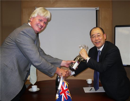 한광희 동부제철 부회장(오른쪽)과 폴 오키프 호주 블루스코프 스틸 사장이 지난달 29일 양사간 전략적 제휴에 합의하고 기념촬영 하고 있다.