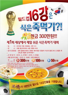 [아시아경제 김대섭 기자] 웰빙 죽전문점 본죽은 오는 23일 열릴 예정인 '제1회 세상에서 제일 쉬운 식은죽먹기 대회'에 나갈 참가자 200명을 모집한다. 이번 행사는 내달 남아프리카공화국 월드컵을 앞두고 대한민국 대표팀의 월드컵 16강 진출이 식은죽 먹기만큼 수월하게 진행되길 기원하는 마음에서 마련됐다. 본죽이 준비한 호박죽을 가장 빨리 먹는 사람이 우승을 하는 방식으로 진행되며 최종 우승자(1명)에게는 현금 300만원을 상금으로 증정할 예정이다. 또 2등(1명)과 3등(1명)에게 각각 100만원, 50만원을 증정한다. 이와 함께 모든 참가자들에게 본죽에서 제작한 월드컵 응원용품과 본죽 상품권을 증정할 계획이다. 참가희망자는 오는 16일까지 본죽 홈페이지(www.bonjuk.co.kr)에서 이벤트 페이지를 다운받아 개인 블로그 및 카페에 스크랩한 후 URL을 댓글로 남기면 된다. 오는 18일 최종 참가자를 선정해 발표한다.김대섭 기자 joas11@<ⓒ세계를 보는 창 경제를 보는 눈, 아시아경제(www.asiae.co.kr) 무단전재 배포금지>