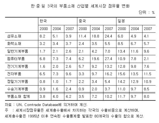 [아시아경제 이경호 기자]중국의 부품업체들이 파죽의 성장세를 보이고 있다. 잇따른 인수합병(M&A)과 외국인투자유치를 통해 키운 기술력을 발판으로 자동차와 컴퓨터,전자부품 등의 분야에서 한국 업체를 맹추격하고 있다.이에 따라 일본 부품 기업을 벤치마킹하고 있는 한국 업체들은 부품분야에서도 일본과 중국 사이에 끼인 샌드위치 신세로 전락하고 있는 형국이다.11일 산업연구원( KIET)의 '한ㆍ중ㆍ일 부품소재 산업의 경쟁력 분석'이라는 보고서에 따르면 2000~2007년 기간 중국의 부품소재 세계시장 점유율은 2000년 3.5%에서 2007년 10.2%로 대폭 높아졌다. 한국은 같은기간 3.8%에서 4.2%로 상승한 반면, 일본은 11.7%에서 8.0%로 하락했다. 2006년 이후 중국의 세계시장 점유율은 일본을 추월했다. 일본에서 반도체, 휴대전화 등 수출 주력품목의 핵심부품을 수입하는 우리나라는 일본을 추격하면서도 중국에 기존 시장을 뺏기는 샌드위치 신세가 됐다. 중국은 자동차와 컴퓨터, 전자 부품 시장에서의 점유율 상승이 두드러졌고, 한국은 전통적으로 강세였던 섬유소재에서 점유율이 감소했다. 자동차부품의 경우 한국과 중국은 2000년 0.9%로 점유율이 같았으나 2007년에는 한국이 2.4%에 그친 반면, 중국은 3.7%로 역전했다. 2007년 기준 섬유소재에서는 3.9%대 24.4%로 6배의 격차가 났다.