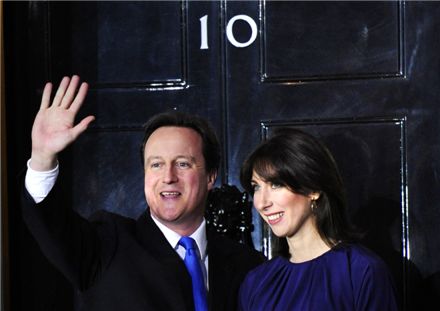 데이비드 캐머런 신임 총리와 그의 부인이 다우닝 10번가에서 손을 흔들고 있다