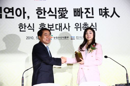 [아시아경제 이규성 기자]“술을 잘못해요, 한 모금 정도죠. 하지만 갈비를 좋아하는데, 막걸리가 잘 어울릴 것 같아요.”12일 한식홍보대사로 위촉된 밴쿠버 동계올림픽 금메달리스트 김연아 선수는 “세계에서 한식을 보다 쉽게 맛볼 수 있기 바라며, 세계인에게 ‘한식’의 맛 과 멋을 알리는데 적극 동참하겠다”고 위촉 소감을 밝혔다. 김 선수는 ‘한식’이 평소 건강과 체력유지에 많은 도움이 되었고, 가장 좋아하는 한식으로 ‘갈비’와 ‘김치찌개’를 꼽았다. 특히 갈비는 힘들고 지친 해외전지훈련 기간 동안 체력과 정신을 회복시킨 좋은 음식이었다며, 갈비를 먹기 위해 외국의 한인식당을 돌아다닌 적도 있다고 말했다. 김 선수는 캐나다 토론토로 돌아가서 운동을 할 대도 한식대사인 만큼 한식당에 해외 동료들과 자주 방문해 한식을 널리 홍보하겠다고 다짐했다. 장태평 농림수산식품부 장관은 “김연아 선수가 흔쾌히 한식홍보대사를 맡아준 것에 감사하며 세계인들이 김연아 선수의 아름다운 점프와 환상적인 연기에 매료되었듯이 한식의 매력에 빠지는 날이 김연아 선수를 통해 앞당겨 질 것으로 기대된다”고 말했다.특히 한식도 김연아 선수가 타임지에 영향력있는 스포츠 선수 2등에 뽑힌 것처럼 세계인이 사랑 받는 음식 2위가 되기를 바란다고 덧붙였다. 위촉식과 함께 장태평 장관은 김연아 선수가 가장 좋아하는 ‘한우 갈비’를, 김연아 선수는 ‘김연아 자서전과 기념주화’를 선물하고 서로에 대한 감사의 의미를 더했다.이규성 기자 bobos@<ⓒ세계를 보는 창 경제를 보는 눈, 아시아경제(www.asiae.co.kr) 무단전재 배포금지>