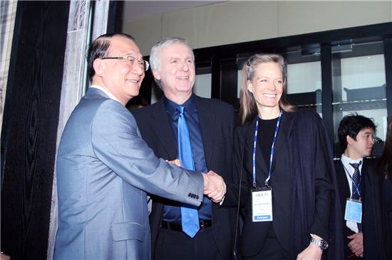 최시중 위원장(왼쪽)과 제임스 카메론 감독(가운데)이 '3D 콘텐츠'를 주제로 간담회를 가졌다.