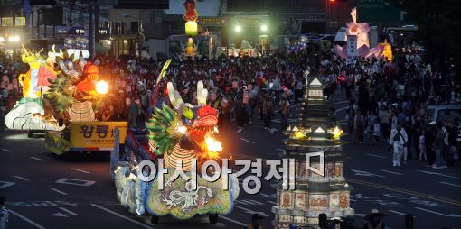 [아시아경제 이재문 기자] 불기 2554년 부처님 오신 날을 봉축하는 형형색색의 연등행렬이 16일 저녁 서울 흥인지문에서 조계사로 향하고 있다. 이재문 기자 moon@<ⓒ세계를 보는 창 경제를 보는 눈, 아시아경제(www.asiae.co.kr) 무단전재 배포금지>