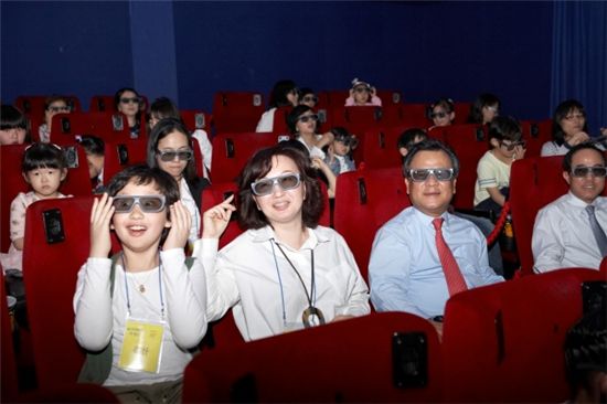 ◆현대건설 김중겸 사장(앞줄 왼쪽 두번째)이 5월 가정의 달을 맞아 지난 14일 사내 기혼 여직원, 자녀들과 함께 서울 상암CGV에서 영화 '드래곤 길들이기'를 관람하는 등의 감성 문화행사를 마련했다.<br />