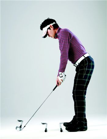 [사진1] 골프채 3개를 타깃과 일자가 되도록 놓고 타깃을 바라본다.