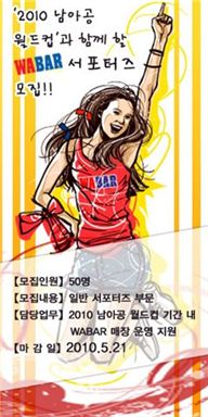 [아시아경제 김대섭 기자] 세계맥주전문점 와바(WABAR)는 내달 열리는 '2010 남아프리카공화국 월드컵'을 앞두고 서포터즈 50여명을 모집한다고 19일 밝혔다.이번에 모집하는 서포터즈는 맥주와 월드컵을 즐기고 주어진 일에 책임을 다하는 20~26세 여성이 대상이다. 서포터즈로 선정되면 월드컵 기간 동안 와바 전직영점에서 열리는 다양한 이벤트에 참여하게 된다. 우수 서포터즈에게는 포상을 비롯한 다양한 혜택을 제공할 예정이다.참가 희망자는 오는 21일까지 신청하면 된다. 자세한 내용은 와바 홈페이지(www.wabar.co.kr) 또는 전화(1588-0581)로 문의하면 된다.김대섭 기자 joas11@<ⓒ세계를 보는 창 경제를 보는 눈, 아시아경제(www.asiae.co.kr) 무단전재 배포금지>