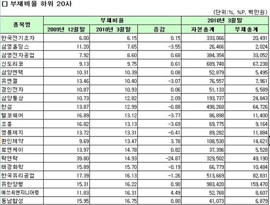 [1Q실적]12월결산 코스피 기업 부채비율 하위 20개사