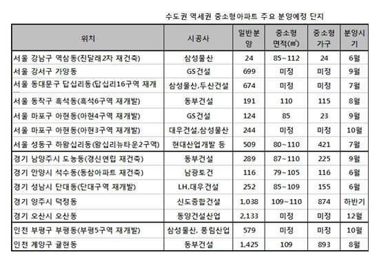 ◆ 서울 뉴타운·재개발 대거 분양 예정= 서울에서는 재건축과 재개발 사업 단지가 대부분이다. 이 중에서 진달래2차 재건축과 왕십리뉴타운, 아현뉴타운에 관심이 모아질 것으로 예상된다. 삼성물산은 강남구 역삼동 진달래2차를 재건축한 464가구 중 85~112㎡ 24가구를 6월에 일반분양한다. 모두 중소형아파트로만 분양되며, 분당선 전철 한티역을 걸어서 5분이면 이용할 수 있다. 성동구 하왕십리동 왕십리뉴타운2구역을 GS건설, 현대산업개발, 대림산업, 삼성물산이 공동 시공해 1148가구 중 80~195㎡ 509가구를 일반분양한다. 중소형아파트는 80~110㎡ 421가구다. 분양시기는 6월 예정. 걸어서 10분 정도면 서울지하철 2호선 상왕십리역과 신당역을 이용할 수 있다. 마포구 아현동 아현3구역은 대우건설과 삼성물산이 컨소시엄으로 사업을 하며, 3241가구 중 110~315㎡ 244가구가 일반분양된다. 중소형아파트 가구수는 아직 미정이며, 10월 분양예정이다. 걸어서 2~3분거리면 서울지하철 2호선 아현역과 5호선 애오개역이 인접하고, 인천공항철도(12월 개통 예정) 공덕역도 도보로 이용할 수 있다. GS건설은 아현4구역을 재개발해 1150가구 중 85~152㎡ 124가구를 9월에 일반분양한다. 여기서 중소형아파트는 85㎡ 23가구이다. 서울지하철 2호선 아현역과 5호선 애오개역이 도보 3~6분거리에 위치. 소의초등, 아현초등, 아현중 등 학군이 풍부하다.동부건설은 동작구 흑석동 흑석6구역을 재개발해 959가구 중 110~177㎡ 191가구를 일반분양한다. 중소형아파트는 110㎡ 115가구이며, 8월에 분양예정이다. 서울지하철 9호선 흑석역이 걸어서 10분이면 이용할 수 있다. 부지 바로 앞에 은로초등과 중대부속중이 위치해 교통과 학군을 두루 갖췄다.