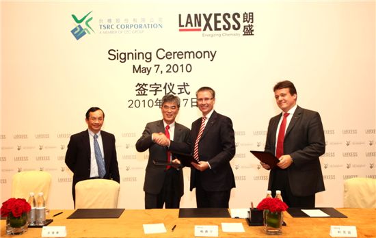 존 첸 TSRC CFO, 웨이 후아 투 TSRC CEO, 베르너 브로이어스 랑세스 경영이사회 이사, 마틴 크래머 랑세스 중국 CE0가 합작으로 NBR 공장 설립을 위한 계약을 맺고 있다.