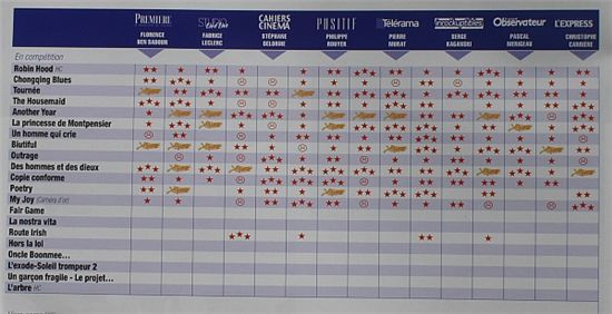 [칸(프랑스)=아시아경제 고경석 기자]이창동 감독의 '시'가 프랑스 11개 매체로부터 평점 2.4점을 받았다.20일(현지시간) 오전 프랑스 영화전문지 필름프랑세스는 데일리를 내놓으며 이창동 감독의 '시'에 대한 프랑스 11개 매체의 평점을 취합해 발표했다. 별점을 숫자로 환산했을 때 평점은 2.4점(2.36점)이다. 11개 매체 중 크루아, 포지티프 등 2개 매체가 별 4개 만점을 줬고, 텔레라마와 루마니테는 별 3개를 줬다. 0점을 준 매체는 없었으나 르 피가로, 르 몽드 는 별 1개를 줬다. 영화 전문지인 프리미어와 카이에 뒤 시네마는 별 2개를 줬다. 앞서 별점을 받은 '하녀'는 15개 매체로부터 평점은 1.67점을 받았고, 지난해 지난해 칸영화제 심사위원상을 받은 박찬욱 감독의 '박쥐'도 당시 15개 매체로부터 1.67점을 받았다.'시'의 평점은 현재까지 별점이 매겨진 13개 작품 중 5위에 해당하는 것으로 프랑스 자비에 보부아 감독의 '신과 인간'(2.9점), 영국 마이크 리 감독의 '어나더 이어'(2.8점), 멕시코 알레한드로 곤잘레스 이냐리투 감독의 '뷰티풀'(2.5점), 프랑스 마티유 아말릭 감독의 '온 투어'(2.5점)이 선두권을 형성하고 있다.한편 칸영화제 수상작은 폐막식이 열리는 23일 발표된다.고경석 기자 kave@<ⓒ아시아경제 & 스투닷컴(stoo.com)이 만드는 온오프라인 연예뉴스>