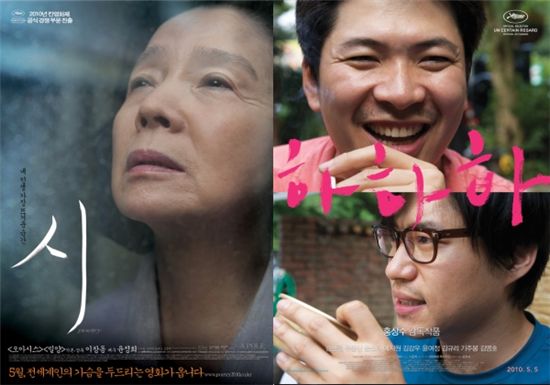 [칸(프랑스)=아시아경제 고경석 기자]이창동 감독의 '시'가 63회 칸영화제에서 각본상을 수상하며 한국영화 2년 연속 칸영화제 경쟁부문 수상을 이뤄냈다.이창동 감독의 '시'는 23일 오후(이하 현지시간) 프랑스 칸 뤼미에르대극장에서 열린 63회 칸영화제 폐막식에서 각본상을 수상했다.홍상수 감독의 '하하하'는 폐막 하루 전인 22일 칸 드뷔시극장에서 열린 주목할만한 시선 시상식에서 대상에 해당하는 주목할만한 시선상을 받았다. 한국영화 칸 진출 26년 만의 첫 번째 기록이다. 일본이 1954년 칸에서 첫 번째 그랑프리(기누가사 데이노스케 감독의 '지옥문')를 수상한 것과 달리 한국영화의 칸 진출은 1984년에야 처음으로 이뤄졌다. '물레야 물레야' 이후 '달마가 동쪽으로 간 까닭은'(1989)이 주목할만한 시선에 다시 초청되기까지 5년의 시간이 흘렀다.칸과 한국영화이 다시 인연을 맺기 시작한 것은 부산국제영화제가 출범한 1996년부터였다. 박신양이 주연을 맡은 양윤호 감독의 '유리'가 비공식 부문인 비평가주간에 초청된 데 이어 1997년 전수일 감독의 '내 안에 우는 바람'이 주목할만한 시선에 초청돼 한국영화의 위상을 높였다. 1996년부터 한국영화는 매해 칸영화제 공식·비공식 상영작 목록에 이름을 올렸다. 칸 공식부문은 경쟁부문과 비경쟁부문, 주목할만한 시선, 특별상영, 클래식, 단편경쟁, 시네퐁다시옹 등으로 구성돼 있으며, 비공식 부문으로는 감독주간, 비평가주간이 있다.1990년대 후반은 한국영화가 양적으로나 질적으로 폭발적인 성장세를 보이던 시기였고 칸영화제도 이를 주목했다. 박찬욱, 김기덕, 홍상수, 이창동 등 새로운 세대의 감독들이 떠오르던 시기이기도 하다. 1998년 홍상수 감독의 '강원도의 힘'은 주목할만한 시선에 초청돼 특별언급되며 말 그대로 국제적인 '주목'을 받았고, 이광모 감독의 '아름다운 시절'은 비공식 부문인 감독주간에 초청됐다. 칸국제영화제 공식 부문 첫 수상자는 장편이 아닌 단편영화에서 배출됐다. 송일곤 감독의 '소풍'이 1999년 단편 경쟁부문에서 심사위원상을 받은 것이다.2000년대에 들어 한국영화의 칸영화제 출입은 빈번해졌다. 2000년 임권택 감독은 '춘향뎐'으로 한국영화 최초로 장편 경쟁부문에 초청되는 영예를 안았다. 이 해에는 홍상수 감독의 '오! 수정'이 주목할만한 시선에 초청됐고, 이창동 감독의 '박하사탕'이 감독주간에서, 정지우 감독의 '해피엔드'는 비평가주간에서 상영됐다.