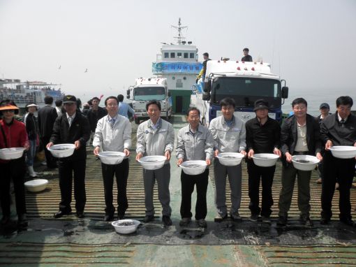 지난 20일, 영흥화력본부와 인천시 관계자들이 작년 10월 이후부터 8개월간 키운 20cm 크기의 민어 치어 5만마리를 옹진군 영흥면 섬업벌 및 석섬 인근 해역에 무상 방류하고 있다.