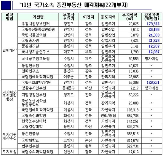 국토부, 지방이전 공공기관 22개 부동산 매각 위해[아시아경제 황준호 기자] 혁신도시로 이전하는 공공기관들이 대거 부동산 매각에 나선다. 매각에 나서는 부동산은 서울 광진구에 위치한 일반주거용도의 우정사업정보센터 등 총 22개다. 감정평가가 끝난 7개 부동산의 감정가만 4054억4400만원에 달해 원활하게 매각될 수 있을지는 지켜봐야 할 전망이다. 25일 국토해양부에 따르면 올해 혁신도시로 이전되는 공공기관의 종전부동산의 매각을 위한 로드쇼가 6월30일 건설회관에서 개최된다. 이날 로드쇼를 통해 매각 예정인 종전부동산은 총 22개로 경북, 광주, 제주, 전북, 경북, 아산, 논산, 충북 등 총 8개 혁신도시로 이전하는 공공기관이 소유한 부동산이 대상이다.매각방식은 일반매각, 지방자치단체 우선매각, 투자기관 매각, 토지보상 등의 방식으로 진행된다. 일반매각은 기업 등 민간에 해당 공공기관이 감정가를 기준가로 제시하면 최고가를 제시하는 곳이 낙찰받는 방식이다. 올해 매각되는 종전부동산 중 총 10개 부동산이 일반매각 방식으로 팔린다. 이중 서울 광진구에 위치한 우정사업정보센터(2만9025㎡, 일반주거 용도)의 감정가격이 1793억2200만원을 기록, 가장 고가의 감정평가를 받았다. 경기도 안양시 국립농산물품질관리원(6612㎡, 일반상업) 261억8600만원, 국립식물검역원(6079㎡, 일반상업) 243억8300만원, 국립종자원(5424㎡, 상업지역) 212억7800만원, 용인시 품질관리단(6141㎡, 일반주거) 129억5700만원, 서울시 마포구 국세청기술연구소(1799㎡, 일반주거) 120억8700만원 등 총 2762억1300만원 규모도 일반매각방식이 적용된다. 또 일반매각 방식으로 나온 매물 중 가장 큰 9만559㎡ 규모의 국세공무원교육원과 함께 농업연수원(수원), 전파연구소(용산), 국립원예특작과학원(여주) 등이 감정평가를 받을 예정이다. 이어 국립축산과학원(화성, 65만7736㎡) 등 7개 기관이 지자체에 우선매각되며 국립경찰대학(용인, 60만9275㎡) 등 4개기관이 투자기관에 팔린다. 이외에도 인천시 국립수의과학검역원 1만7612㎡는 토지보상 방식을 통해 매각된다. 국토부 관계자는 "지난해부터 올해까지 총 6개 공공기관의 종전부동산을 매각했다"며 "올해 22개, 내년 이후 13개의 종전부동산을 매각할 계획"이라고 밝혔다. 한편 로드쇼에는 기업 등 민간과 지자체 등 공공기관 관계자를 포함해 500여명이 참석할 예정이다.