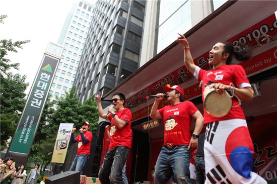 남아공월드컵이 18일 앞으로 다가온 가운데 서울 여의도 증권가에서도 응원전이 펼쳐졌다. 25일 컬투와 캔이 현대증권 본사 앞에서 게릴라콘서트를 펼친 것. 점심시간을 이용해 흥겨운 공연이 열렸으며 붉은색 티셔츠와 음료, 기념품이 관객에게 선물로 주어졌다.이솔 기자 pinetree19@<ⓒ세계를 보는 창 경제를 보는 눈, 아시아경제(www.asiae.co.kr) 무단전재 배포금지>