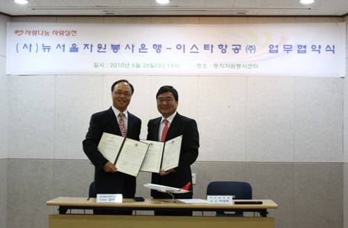 [아시아경제 손현진 기자]이스타항공과 사단법인 뉴서울 자원봉사은행이 26일 동작자원봉사은행에서 업무협약을 맺고 자원봉사참여자 항공권 할인, 자원봉사행사지원, 이스타항공 임직원 자원봉사 참여 등을 함께 진행하기로 했다.뉴서울 자원봉사은행은 '동작자원봉사센터' '중구자원봉사센터' '동작어린이도서관' '사당청소년문화의집'을 위탁 운영하는 민간업체다. 특히 자원봉사시간을 적립할 수 있는 '사랑나눔통장'을 발급해 통장에 적립된 자원봉사시간을 봉사자 본인이나 지정한 사람이 필요시 인출해 봉사를 받을 수도 있는 제도를 운영하고 있다.이상직 이스타항공 회장은 "지역사회에 꼭 필요한 기관인 자원봉사단체의 선두에서 타 지역의 모범이 되고 있는 뉴서울 자원봉사은행과 업무협약을 체결하게 되어 더없이 기쁘다"면서 "이스타항공이 국민항공사로서 항공여행의 대중화를 위해 힘써왔듯 앞으로 기업에서 지원하고 참여할 수 있는 모든 역량을 다해 지역주민들과 함께 봉사하는 또 다른 국민항공사로의 역할에 최선을 다하겠다"고 말했다.손현진 기자 everwhite@<ⓒ세계를 보는 창 경제를 보는 눈, 아시아경제(www.asiae.co.kr) 무단전재 배포금지>