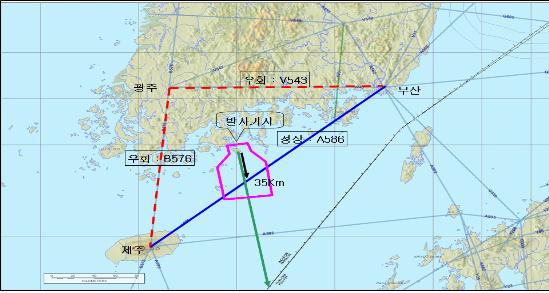 나로호 발사 영향권 내 항로 및 우회 항공로(부산↔제주)<br />