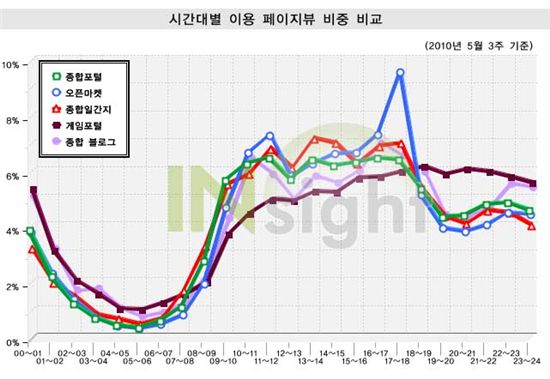 [아시아경제 김철현 기자]인터넷 서비스 이용시간을 분석한 결과 쇼핑은 퇴근 직전, 게임은 심야에 사용자들이 많은 것으로 나타났다.웹사이트 분석평가 전문업체 랭키닷컴은 5월 세째주 시간대별 이용 페이지 조사 결과 오픈마켓의 페이지 비중이 가장 높은 시간대는 퇴근시간 직전인 오후 5시에서 6시 사이로 나타났다고 27일 밝혔다.게임포털의 경우에는 직장인의 퇴근시간과 관계없이 꾸준한 이용량을 보였고, 새벽 시간에 상대적으로 높은 이용량을 보여 저녁시간 이후 심야에 사용자가 많은 것을 확인할 수 있었다.랭키닷컴 관계자는 "이번 조사는 포털, 전자상거래, 미디어, 게임, 블로그 이용자들의 평균 시간대별 이용 페이지뷰를 통해 이용량을 분석한 것으로 서비스별 주 이용 시간대 차이를 알 수 있다"고 설명했다.한편 조사 결과 오픈마켓과 게임포털을 제외한 나머지 서비스에서는 유사한 곡선을 보였는데, 포털과 블로그의 경우 출근 직후인 오전 9시~10시에 상대적으로 높은 페이지뷰 비중을 보였고, 오히려 점심시간은 낮게 나타났다.블로그는 특히 저녁 10시 이후의 심야와 새벽 시간대에 상대적으로 높은 이용량을 보였다. 또 종합 일간지의 경우 직장인들의 점심시간 직후인 오후 1시~2시 사이에 이용량이 많은 것으로 나타났다.김철현 기자 kch@<ⓒ세계를 보는 창 경제를 보는 눈, 아시아경제(www.asiae.co.kr) 무단전재 배포금지>