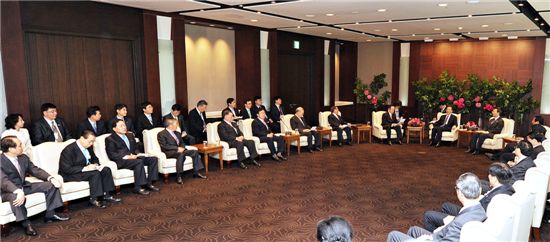 사공일 무역협회장 등 한국경제인 9명과 중국 원자바오 총리 일행은 29일 오전 신라호텔에서 간담회를 가졌다.