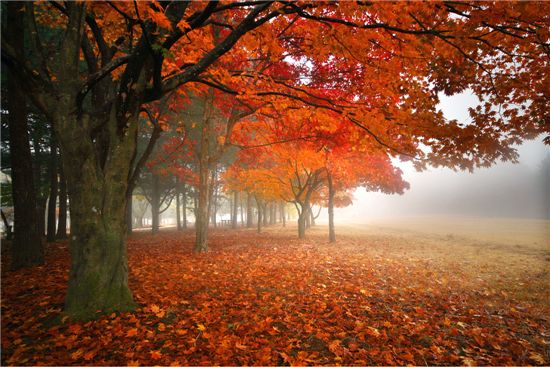 [Photo Story]가을 남이섬의 아침을 촬영한 사진입니다. 원경의 안개와 전경의 단풍의 색 표현에 중점을 두었고 조리개를 f5.6에 설정하여 원경의 디테일이 강조되도록 의도한 촬영입니다.단순한 화면.<br />