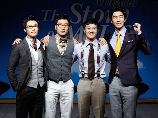 Press conference for musical "Story of My Life" This summer, fans of musicals will be able to see veteran musical actors Ryu Jung-han and Lee Suk-jun, who made their debut over ten years ago, and fresh newcomers Shin Sung-rok and Lee Chang-yong, who dreamt of being musical stars watching them on stage. The press conference for the musical "Story of My Life," about the thirty-year friendship between characters Thomas (played by Ryu Jung-han and Shin Sung-rok) and Elvin (played by Lee Suk-jun and Lee Chang-yong), was held May 31 at Seoul's Dongsoong Art Center. There was another reason besides the casting of these four very different actors that "Story," which first premiered on Broadway in March 2009, caused a stir; Shin Chun-soo, President of OD Musical and one of the producers for the original Broadway show, would be directing the local production. The five lyrical musical numbers revealed at the press conference reinforced what Shin said about the show -- that it is "going in the opposite direction of the current trend in the musical market." Below is the joint interview with the five men of "Story," which will run at Dongsoong Art Hall from July 13 through September 19. Q: You were one of the producers for the original Broadway production in 2009. What made you decide to make the local version? Shin Chun-soo: Actually, you could say that "Story" is a musical that goes in the opposite direction of the current popular trend in Korea's musical market, one that goes against the general trend. Many recent musical productions focus on showing fancy stage mechanisms, but this show started from my desire to tell an honest, simple story between two actors that I saw on Broadway in 2009. Q: Can you give a brief introduction of the musical? Shin: I am newcomer director Shin Chun-soo. (laugh) There are two characters in the musical -- Thomas and Elvin. They have been friends for a long time but have grown apart. Then Thomas hears of Elvin's death. The story begins with Thomas returning home to keep the promise the two made -- that when one of them dies first, the other would write a eulogy for him. Shin Sung-rok: Thomas is a writer whose best-selling book was inspired by his precious friend Elvin. Lee Chang-yong (Lee): Elvin is an innocent friend who has remained the same over the years. You know, one of those crazy, unconventional buddies from your childhood days? He is one of those buddies. (laugh) Lee Suk-jun (Lee SJ): This musical is hard to explain because the story doesn't play out chronologically but through how Thomas remembers things from his imagination. Thomas eventually discovers through his dead friend Elvin the old memories that he couldn't find himself. Like the last song "Angel In The Snow," it is saying that everything Thomas will be writing from now on will remain Elvin and Thomas' memories. It is sending the message that our story will go on forever through our friendship and through everything that we saw -- a rock, wave, sky or movie we saw together. I think it is a story that gives the message that such things surpass friendship and exist inside you and me. Q: Ryu Jung-han, you have mostly performed at big venues. This will be your first time in a long time to do a two-person play at a small theater. What made you do want to do this? Ryu Jung-han (Ryu): I did a two-person play in 2007 for the premiere production of "Thrill Me" and I'm doing it again with "Story." I feel as much excitement as burden about it. Once the show starts, I think there will be a lot of comparison made to "Thrill Me" and I hope to find what I had lost by the time the show ends its run. I think it will be a chance for me to feel quietly moved and think about the things that I had forgotten about. But I can't really understand the character Thomas even after reading the script many times. I will have to keep trying to find out. Q: It wasn't too long ago that play "A Streetcar Named Desire" ended. What parts of the musical attracted you? Lee SJ: I think I was truly happy with the story when I first read the script. I am actually curious how the musical will touch the audience. As a veteran, non-mainstream actor, (laugh) I have pride in myself for having done many two- or three-person plays over the years. But in "Story," perfect chemistry between the two actors is so crucial that it could either make or break the show. I think people are growing tired of the current show-type musical these days. Many musicals try to force certain emotions into its audience, as if to say "This is what we have for you hence what you should feel" but "Story" doesn't try to force viewers into feeling sad. Just like the saying, "even though it is a sad song, don't sing it in a sad way," one can feel one's heart warming when it hears a sincere story. Q: Shin Sung-rok, you have taken on the same role as Ryu Jung-han, just like you did in "Monte Cristo."Shin SR: I was rehearsing for "Monte Cristo" when one day, Ryu asked if I would want to work [on "Story"] with him. I didn't know what it would be about but I said, "It would be an honor for me to even just stand on the same stage as you." I had really wanted to do a musical where its structure allows only two or three actors take the lead, and "Story" was that very kind of production. I took on the production just for the fact that I would be getting to work with such great musical actors. I wanted to stand on stage with Ryu but I guess I won't be doing that technically because we're playing the same role. (laugh)Q: You're working on the same production but was a producer for it on Broadway while you're directing it in Korea. What are the points you are focusing on as a director?Shin CS: I wanted to give "Story" a shot in Korea even though it didn't run for long on Broadway. Each and every one of the creators who took part in this production are amazing but I personally believe that Korean actors are better at expressing their emotions than American actors so that is why the cas