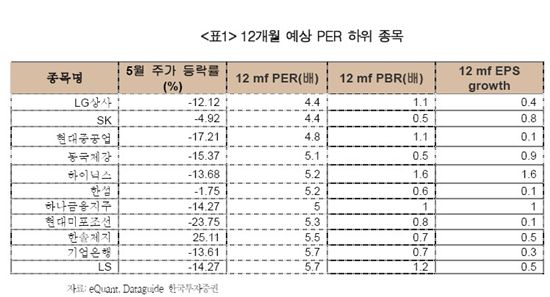 [아시아경제 전필수 기자]지난달 증시 급락으로 국내 증시의 배률에이션 매력이 크게 높아졌다. 12개월 예상 PER(주가수익비율)가 8.7 수준으로 떨어졌다. 여전히 추세는 불투명하다는 전망이 우세하지만 밸류에이션 매력이 두드러진 종목에 대한 관심은 높아졌다.한국투자증권은 3일 주가 하락률이 크면서 12개월 예상 PER가 낮은 종목들을 주목하라고 권고했다. 유럽발 위기의 불안감이 진정되고 2분기 실적이 다가오는 만큼 이익 모멘텀에 따른 반등을 기대할 수 있다는 이유에서다.위세정 애널리스트는 LG상사(12개월 예상 PER 4.4배) SK(4.4배) 현대중공업(4.8배) 등 PER 6배 이하의 11개 저PER 종목을 추렸다.