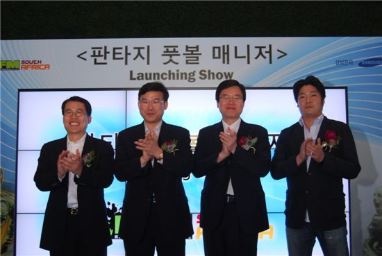 왼쪽부터 10일 '판타지 풋볼 매니저' 런칭쇼에 참가한 위메이드 서수길 대표, 삼성전자 권강현 상무, sbs김진원 이사, 액소드 스튜디오 최성욱 대표