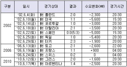 [아시아경제 이경호 기자]월드컵 기간에 한국대표팀 경기가 있을 땐 오히려 전력수요가 전체적으로 줄고 외국팀간 경기가 있을때는 늘어나는 것으로 조사됐다. 대표팀 경기날에는 온 국민의 열기가 전력수요로 연결될 것 같지만 실제로는 그렇지 않다는 것이다. 19일 전력거래소가 월드컵과 전력수요 상관관계를 분석한 결과, 외국팀간의 경기 시에는 수요가 경미하게 증가한 반면 한국팀 경기 시에는 오히려 큰 폭으로 감소했으며 한국팀의 경기에 대한 국민들의 관심도가 높아질수록 변화폭은 더 커졌던 것으로 나타났다. 전력수요 감소 원인은 한국팀 경기가 주로 경제활동 시간대에 진행됨에 따라 TV시청이나 거리응원에 많이 참여할 수 있도록 산업체들이 조업을 줄인데 따른 것으로 보인다. 또한 경기시간에 따라 수요특성도 조금씩 차이가 있었다. 경기시간이 야간인 경우에는 주로 산업용 전력수요만 감소했으나 주간에는 일반용(업무용, 상업용) 전력수요도 감소했고 심야시간대에는 점등수요가 약간 증가했다.온 국민들의 깊은 관심속에 치러진 2002 한일 월드컵에서는 한국대표 선수들의 선전에 힘입어 전력수요가 1900 ∼ 5600㎿ 감소 하였다. 첫 경기인 폴란드전 승리 이후 전력수요 감소폭은 계속 커졌으며, 독일과의 4강 경기에서는 야간경기임에도 불구하고 수요가 5600㎿나 감소했다. 2006년 독일 월드컵에서는 월드컵에 대한 열기가 줄어들고 야간, 새벽에 경기를 치르게 되어 전력수요변화량은 크지 않았다. 지난 6월 12일에 치러진 2010년 남아공 월드컵 그리스와의 첫 경기에서는 전력수요가 1600㎿ 감소했고 국민들의 높은 관심 속에 치러진 6월 17일 아르헨티나전에서는 2500㎿ 감소해 과거 월드컵 경기때와 유사한 패턴을 보였다. 이경호 기자 gungho@<ⓒ세계를 보는 창 경제를 보는 눈, 아시아경제(www.asiae.co.kr) 무단전재 배포금지>