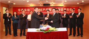 삼성화재 중국법인 정현준 법인장(사진 앞줄 오른쪽)과 화태재산보험주식회사(華泰財産保險株式會社) 자오밍하오(趙明浩) 총경리(사진 앞줄 왼쪽)가 업무제휴식을 갖고 서로 악수하고 있다. <br /> <br />