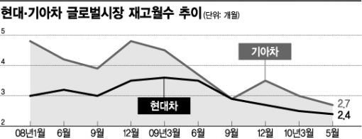 [아시아경제 박수익 기자] 현대자동차의 글로벌시장 판매 호조가 지속되면서 재고량이 꾸준히 감소하고 있는 것으로 나타났다. 이에따라 일부지역에서는 재고부족이 나타나는 등 생산이 판매를 따라가지 못하는 현상도 발생하고 있다.21일 현대차그룹과 증권업계에 따르면 지난달 기준 현대차의 글로벌 재고는 2.4개월 판매분을 기록 중이다.현대차의 글로벌 재고는 금융위기 직후인 2008년말 3.5개월까지 올라갔지만, 이후 원·달러 환율 상승과 브랜드 가치 제고 등에 힘입어 판매 호조를 보이면서 지난해 말 2.7개월, 올 1분기 2.5개월 등 지속적으로 감소세를 보이고 있다.현대차 관계자는 "내부적으로 적정 재고량을 3개월분 정도로 보고 있다"며 "재고량이 낮은 것이 반드시 좋은 것은 아니지만 최근 적정재고량을 밑도는 추세는 그만큼 글로벌판매가 잘 되고 있다는 의미"라고 설명했다.재고 감소가 지속되면서 현대차의 글로벌 공장 가동률은 높아지고 있다. 지난 5월 글로벌 공장 가동률은 96%선으로 1년 전 81%에 비해 대폭 향상됐다. 특히 미국과 중국공장 가동률은 110%선으로 완전가동이 이뤄지고 있다. 이에따라 현대차는 중국 베이징 3공장(연산 30만대), 러시아공장(15만대), 브라질공장(10만대) 등 해외공장 생산 신·증설에 본격 나서고 있다.안수웅 LIG투자증권 리서치센터장은 "낮은 재고와 높은 가동률이 유지되면서 생산이 판매를 따라가지 못하는 상황이 나타나고 있다"며 지난해 하반기 이후 지속되는 실적호조세를 바탕으로 공격적 마케팅 전략을 펼친다면 하반기 글로벌시장 점유율이 재차 상승할 가능성이 높다"고 분석했다.한편 기아차 역시 글로벌 재고가 지난 5월 기준 2.7개월분을 기록하며 2008년말 4.8개월분, 2009년말 3.5개월분 대비 큰 폭으로 떨어진 것으로 나타났다. 공장가동률도 1년 전 63%에서 현재 80%선으로 올라섰다. 외국계투자사인 UBS는 이와관련 "기아차 재고 감소를 감안할 때 노조의 파업이 발생한다면 여파는 과거보다 더 클 것"이라는 분석을 내놓기도 했다.박수익 기자 sipark@<ⓒ세계를 보는 창 경제를 보는 눈, 아시아경제(www.asiae.co.kr) 무단전재 배포금지>