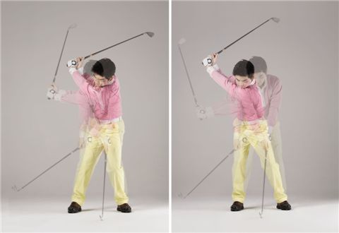 ▲ 백스윙= <사진 2>를 보자. 스택 & 틸트의 백스윙이다. 체중이 처음부터 왼쪽 발에 실려 오른쪽 발로 체중을 지탱할 필요가 없다. 엉덩이는 그저 제자리에서 회전만 하면 된다.스윙 아크를 크게 만들기 위해 오른쪽 무릎은 자연스럽게 펴진다. 기존 이론은 스윙 축이 오른쪽 발에도 있어 엉덩이 역시 오른쪽 발로 이동해야 한다.백스윙 톱도 마찬가지다. 오히려 무게 중심이 과도할 정도로 왼쪽 발에 쏠려 있는 자세가 맞다. 이 동작이 바로 '스택(힘의 응축)'이다.어찌 보면 예전에 코치들이 '하지 말라고' 강조했던 '역피봇'과 비슷하다. 하지만 걱정할 필요는 없다. 또 다시 같은 궤도로 풀어주면 그만이다. 여기서 주의할 점은 다운스윙에서 스윙축이 움직이면 절대 안된다.