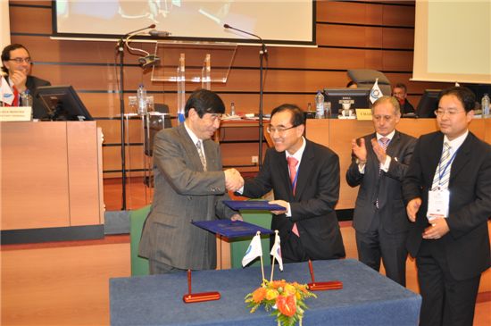 윤영선 관세청장(왼쪽에서 두번째)이 WCO지역훈련센터 유치에 따른 MOU를 주고 받으면서 악수하고 있다.