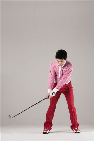 [사진1] 백스윙을 시작하면서 체중을 왼쪽 발에 둔다.