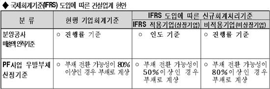 [아시아경제 소민호 기자] 내년부터 도입될 국제회계기준(IFRS)으로 부채비율 폭등을 우려하는 건설업체들에 퇴로가 열릴 전망이다.시행사를 두고 분양을 진행하는 주택사업의 프로젝트파이낸싱(PF) 금액을 부채로 인식하지 않도록 하는 방안을 한 대형 건설업체에서 마련한 것으로 나타났다. 통상적으로 건설업체가 시행사 대신 금융기관에 지급보증하는 것과 달리, 이 건설사는 채권 금융기관의 협조 하에 시행사와 별도 계약을 맺고 PF 잔금을 시행사의 대출로 전환하는 형태를 취했다.이처럼 PF에 대한 지급보증을 하는 대신 시행사와 금융사간 계약으로 바꾸면 IFRS의 회계처리기준상 건설업체의 부채로 잡히지 않는다. IFRS의 PF사업 우발부채 선정기준은 부채전환 가능성이 50% 이상인 PF사업의 지급보증에 대해 해당 금액을 모두 건설사 부채로 계상하도록 하고 있다. 상장된 건설업체와 달리 비상장사는 부채전환 가능성이 80% 이상인 PF 사업에 대해 부채로 계상된다. 해당 건설사 관계자는 "현재 분양사업이 진행중인 프로젝트에 대해 시행사와 함께 별도 계약을 맺고 PF를 대출로 전환했다"면서 "내년 IFRS가 도입되더라도 주택사업으로 인한 과도한 부채비율 상승을 막을 수 있을 것"이라고 설명했다.건설업계는 현재의 재무상태가 그대로 승계되는데도 회계기준이 바뀌어 갑작스럽게 부채비율이 급상승하는 등 폐해가 예상된다며 당혹해하고 있다. 하지만 이처럼 PF를 지급보증하는 대신 시행사와 금융기관간 계약 형태로 전환하게 되면 일시적인 회계상의 혼란을 막을 수 있을 것으로 내다보고 있다.건설사들은 부채전환 가능성을 판단하는 기준이 명확치 않아 대부분의 PF가 부채로 전환될 가능성이 높다며 갑작스런 부채비율 상승으로 인한 투자자 등 고객의 오해가 이를 계기로 불식될 수 있기를 희망하고 있다. 대한건설협회는 IFRS 도입이 예고돼 있지만 내년 들어 건설업체들의 부채비율이 크게 치솟으면 소비자나 주식 투자자들이 혼선을 빚을 가능성이 높다며 대안마련이 시급하다고 지적해왔다.건설업계는 이 같은 대안과 함께 자체 부동산개발사업을 통해 부채비율을 높이지 않는 방안에 대해서도 검토중인 것으로 나타났다. 자체적으로 확보한 현금이 적지않은 건설사들이 자체 확보한 땅에서 분양사업을 시행할 경우 부채비율이 지급보증 방식을 활용하지 않을 수 있다는 이유에서다.이와관련 한신정평가는 최근 보고서를 통해 "IFRS 시스템에서는 부동산개발 사업구조나 자금조달 방식에 대한 건설사들의 대응방법이 달라질 것"이라며 "시행과 시공을 분리하지 않은 자체 개발사업 비중이 늘어날 것"이라고 내다봤다.부채비율 해소방안이 제기됐으나 매출액 인식기준의 변화에 따른 단기 매출 및 이익감소 현상은 피해가기 어려울 것으로 보인다. IFRS에서는 상장기업의 분양사업에 대한 매출액 인식을 진행률이 아닌 인도 기준으로 산정하도록 한다. 따라서 상장 건설사들은 2~3년간 분양사업의 계약금이나 중도금 등과 관계없이 준공시점에야 매출이 발생하게 돼 매출액이 급감하고 이익이 줄어들 가능성이 높다.한편 IFRS(International Financial Reporting Standards)는 글로벌 기업들의 재무제표 이중작성 부담을 경감시키고 재무정보에 대한 국제적 신뢰성을 확보하기 위해 2005년 EU 지역 회사들을 필두로 확산되기 시작했다. 현재 캐나다, 호주 등 전 세계 약 110여개 국가, OECD 가입국의 80%가 IFRS를 적용했거나 도입을 추진하고 있다. 우리나라에서는 2011년부터 상장업체에 의무적으로 적용된다.소민호 기자 smh@<ⓒ세계를 보는 창 경제를 보는 눈, 아시아경제(www.asiae.co.kr) 무단전재 배포금지>