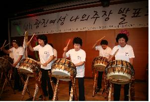 2008년 개최된 ‘광진여성 나의주장 발표회’에서 어머니들이 난타공연을 하고 있다. <br />