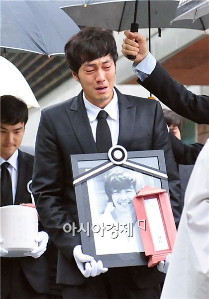 Actor So Ji-sub, holding late actor Park Yong-ha's portrait in his hands, sobs while leading a procession of friends and family carrying the remains of Park after he is cremated at a crematorium in the city of Sungnam of Gyeonggi Province, South Korea on July 2, 2010.Photographer : Park Sung-Ki musictok@Editor : Jessica Kim jesskim@<ⓒ10Asia All rights reserved>