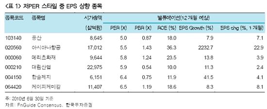 [아시아경제 이창환 기자] 7월 국내 증시가 박스권에 머물 것이라는 예상이 많은 가운데 낮은 주가수익비율(PER)을 지닌 종목 중 주당순이익(EPS) 추정치가 상향되고 있는 이들로 포트폴리오를 구성하는 것이 유리하다는 주장이 나왔다.4일 노근환 한국투자증권 애널리스트는 보고서를 통해 "시장의 밸류에이션이 낮아진 점을 감안해 추천했던 저PER 스타일의 6월 수익률(8.9%)은 벤치마크(6.8%)를 2.1%포인트 상회하는 성적을 기록했다"며 "7월 스타일 전략도 6월과 마찬가지로 낮아진 시장의 밸류에이션을 반영하여 저PER 스타일로 구성할 것"을 추천했다.특히 PER이 낮은 종목 중 EPS 추정치가 상향되고 있는 종목들인 풍산, 아시아나항공, 메리츠화재, 한솔제지, 대림산업, 케이피케미칼 등을 노 애널리스트는 추천했다.