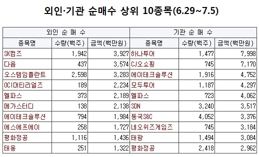 [아시아경제 박형수 기자]코스닥 지수가 490선을 내주자 외국인과 기관은 각각 인터넷주와 여행주 비중 높인 것으로 나타났다. 7일 금융투자업계에 따르면 지난달 29일부터 지난 5일까지 코스닥 시장에서 외국인과 기관은 각각 514억원 순매도, 134억원 순매수를 기록했다. 외국인은 코스닥 지수가 종가기준으로 1개월 가까이 머물렀던 490선을 내주고 480선으로 물러났음에도 글로벌 증시가 안정되기를 기다리는 전략을 취하고 있는 것으로 분석됐다. 코스닥 전체 시장에서 매도 우위를 유지했다고는 하지만 SK컴즈와 다음 등 인터넷 관련주에 대해서는 매수 우위를 보였다. 외국인은 지난달 29일 부터 5일까지 5거래일 동안 SK컴즈에 대해 39억2700만원 순매수를 기록했으며 35억7400만원 규모의 다음 주식을 사들였다.