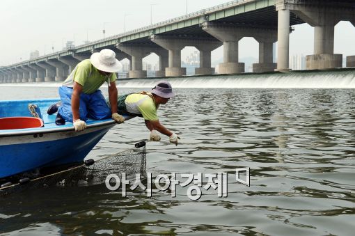 [아시아경제 이재문 기자]서울시 환경과 직원들이 8일 오후 잠실대교 수중보에서 한강 어종조사를 실시하고 있다. 이번조사로 잉어, 누치, 큰납자루 등 18종(전체의 약 40%)으로, 지난해 13종에 비해 5종이 늘어 다양한 어종이 한강에 고르게 분포하고 있는 것으로 나타났다.이재문 기자 moon@<ⓒ세계를 보는 창 경제를 보는 눈, 아시아경제(www.asiae.co.kr) 무단전재 배포금지>