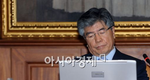 [아시아경제 이재문 기자]김중수 한국은행 총재가 9일 오전 서울 중구 한국은행에서 열린 금융통화위원회의에서 모니터를 보며 생각에 잠겨 있다.이재문 기자 moon@<ⓒ세계를 보는 창 경제를 보는 눈, 아시아경제(www.asiae.co.kr) 무단전재 배포금지>