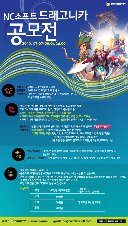 [아시아경제 김수진 기자] 엔씨소프트(대표 김택진)의 역할수행게임(RPG) '드래고니카'는 7일부터 다음달 4일까지 게임기획과 그래픽 디자인 부문 공모전을 진행한다고 밝혔다. 이번 공모전은 울산애니원 고등학교, 한국애니메이션고등학교, 충남애니메이션고등학교 등 3개교를 대상으로 진행된다. 참가를 원하는 해당 학교 학생들은 공모전 홈페이지에 자신이 만든 작품과 함께 참가 신청서를 제출하면 된다. 엔씨소프트는 '드래고니카'에 대한 이해를 바탕으로 컨텐츠 개선안이나 신규 시스템 문서, 직접 그린 신규 던전 및 보스의 이미지 파일을 제출하면 된다고 설명했다. 출품작들은 차별성, 완성도, 실제 게임에 적용할 수 있는지의 여부 등을 기준으로 심사를 받게 된다. 공모작 당선자들에게는 총 500만원 상당의 상금이 지급되며 당선작 중 게임과 어울리는 작품은 실제로 게임 내 구현되는 기회가 부여된다. 엔씨소프트 사업 2실 신민균 실장은 “'드래고니카'를 통해서 10대들이 게임을 단순히 소비하는 것이 아니라 자신만의 아이디어로 개발에까지 참여할 수 있는 기회를 열어줄 예정"이라며 "10대 청소년들의 아이디어를 글로벌 콘텐츠에 적용할 수 있는 기회"라고 강조했다. 드래고니카 공모전에 대한 자세한 절차 및 시상내역 등은 대회 공식 홈페이지()에서 확인할 수 있다.김수진 기자 sjkim@<ⓒ세계를 보는 창 경제를 보는 눈, 아시아경제(www.asiae.co.kr) 무단전재 배포금지>