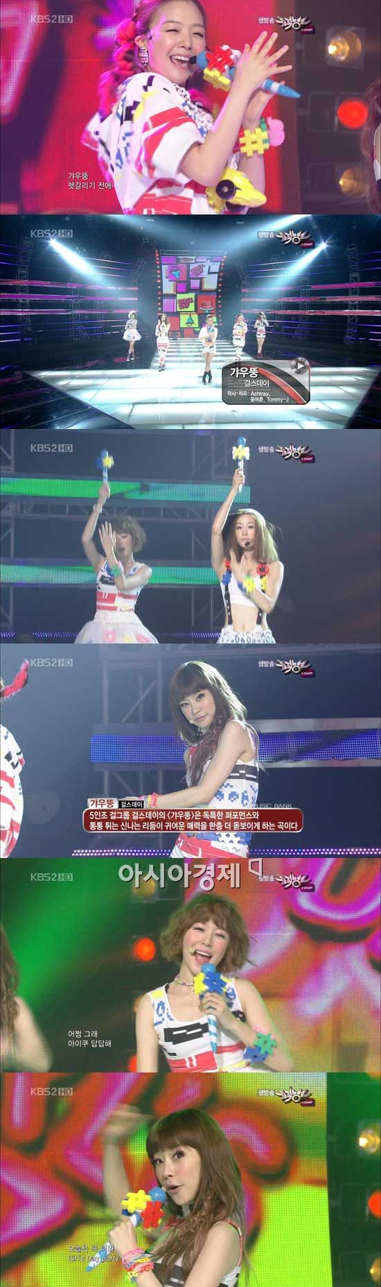 [아시아경제 최준용 기자]신예 5인조 걸 그룹 걸스데이가 베일을 벗었다.걸스데이는 9일 오후 5시 50분부터 생방송으로 진행된 KBS2 '뮤직뱅크'에 출연해 데뷔 미니음반 수록곡인 ‘갸우뚱’을 공개했다.이날 타이틀곡 ‘갸우뚱’ 무대에서 걸스데이는 화려한 의상으로 시선을 끌었으며 신인답지 않은 침착한 모습으로 무대의 완성도를 높였다.멤버 5명 전원이 각자의 색깔과 매력을 트위터로 알리기 시작해 현재 해외에 수십여개의 팬클럽이 생기는 등 걸스데이에 대한 관심이 뜨겁다. 타이틀곡 ‘갸우뚱’은 마음에 드는데도 자신에게 선뜻 다가서지 못하고 멀뚱멀뚱 바라만 보고 있는 우유부단한 연인에게 고개를 갸우뚱 거릴 수밖에 없는 안타까움을 표현한 노래다. 이곡은 이수영, 이정현, 안진경 등 여러 여가수들의 음반에 참여하면서 최근 떠오르고 있는 작곡 콤비인 애시트레이와 윤여훈 그리고 신인 작곡가 토미 J가 협업해 완성했다. 이날 무대에는 LPG, 나오미, 소리, 영건, 시스타, 인피니트, 노라조, ZE:A(제국의 아이들), 걸스데이, 포미닛, 써니사이드 MJ, 미스 에이, 코요태, 원투, 나르샤, 씨앤블루, 태양, 손담비, 슈퍼주니어 등이 출연했다.최준용 기자 yjchoi01@<ⓒ아시아경제 & 스투닷컴(stoo.com)이 만드는 온오프라인 연예뉴스>