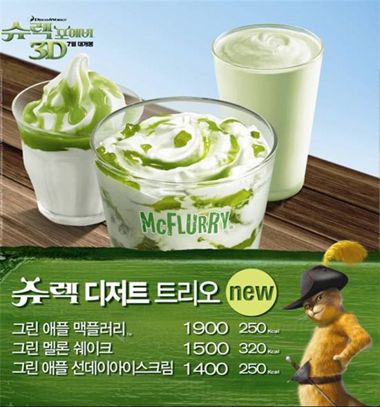 [아시아경제 박소연 기자]한국 맥도날드는 여름 한정 디저트 메뉴 '슈렉 디저트 트리오'를 오는 9월30일까지 판매한다.애니메이션 '슈렉 포에버'의 개봉에 맞춰 출시한 슈렉 디저트 트리오는 그린 애플 맥플러리, 그린 멜론 쉐이크 및 그린 애플 선데이아이스크림 등 3종으로 구성돼 있다.우유로 만든 부드러운 느낌의 아이스크림인 맥플러리와 선데이아이스크림은 상큼한 사과의 씹는 맛을 느낄 수 있고, 쉐이크는 달콤한 메론향이 살아있다.슈렉 디저트 트리오는 선데이아이스크림이 1400원, 쉐이크는 1500원, 그리고 맥플러리는 1900원에 각각 판매된다. 박소연 기자 muse@<ⓒ세계를 보는 창 경제를 보는 눈, 아시아경제(www.asiae.co.kr) 무단전재 배포금지>