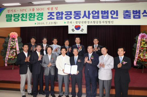 김문수 경기지사(가운데 좌측)와 조상호 SPC그룹 ㈜샤니 대표이사(가운데 우측)는 12일 오후 농협중앙회 경기지역본부에서 친환경농업 육성사업에 상호 협력하는 내용의 양해각서(MOU)를 체결했다.