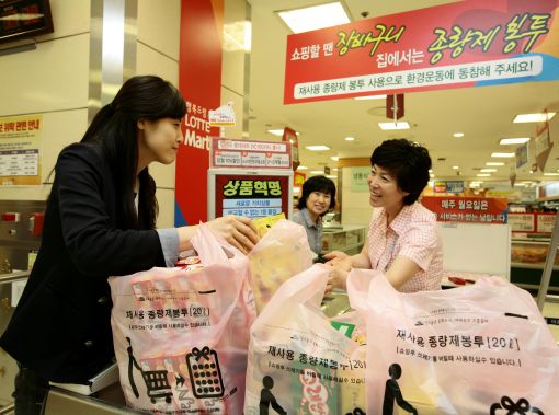 [아시아경제 조인경 기자] 롯데마트가 일회용 비닐봉투 사용을 줄이고 자원 재활용을 통한 환경보호에 동참하기 위해 15일부터 전국 49개 매장에서 '재사용 종량제 봉투'를 판매한다. 재사용 종량제 봉투는 마트에서 쇼핑할 때는 장바구니로 활용하고 가정에서는 쓰레기를 담아 버릴 수 있는 봉투로, 일반 비닐봉투와 규격이나 모양이 유사하며 손잡이가 부착돼 있어 사용이 편리하다.박윤성 롯데마트 판매본부장은 "그동안 월드점에서만 재사용 종량제 봉투를 사용해왔으나 환경친화적인 제도라는 판단 아래 유통업체로는 처음으로 전국 단위로 대폭 확대 시행하게 됐다"며 "앞으로 각 지방자치단체의 시행 일정에 맞춰 더 많은 점포로 확대해 나갈 방침"이라고 말했다.재사용 종량제 봉투는 지난 2008년 행정안전부가 국민을 대상으로 공모한 아이디어에서 채택돼 사용되고 있으며, 일회용 비닐봉투를 대체해 환경보호에 기여하는 동시에 일회용 봉투 구입비 50원을 절약할 수 있다는 장점도 있다. 이를 위해 롯데마트는 지난 5월부터 롯데마트가 소재한 전국 자치단체 중 재사용 종량제 봉투를 사용하고 있거나 계획중인 시, 군, 구청과 접촉해 이 가운데 봉투 품질이 양호한 자치단체들과 협의를 거쳐 전국 85개 점포 중 절반이 넘는 49개 점포에서 판매하게 됐다. 다만 기존 종량제 봉투 규격이 5L, 10L, 20L, 50L, 100L 등으로 다양한데 비해 재사용 종량제 봉투는 시행 초기인 만큼 지역별로 10L, 20L, 30L 가운데 1~2종류만 우선 판매하며, 가격은 지자체별로 기존 종량제 봉투와 동일하게 책정된다.또한 서울시를 제외한 지역에서는 15일부터 4주 동안 초기 홍보 차원에서 묶음 판매시 가격을 3% 가량 할인해 준다.재사용 종량제 봉투는 매장 계산대나 기존 종량제 봉투 판매장소에서 낱개 또는 묶음단위로 판매하며, 특히 계산시 직원에게 요청하면 일회용 봉투처럼 받아서 즉석에서 바로 장바구니로 사용할 수 있다.조인경 기자 ikjo@<ⓒ세계를 보는 창 경제를 보는 눈, 아시아경제(www.asiae.co.kr) 무단전재 배포금지>