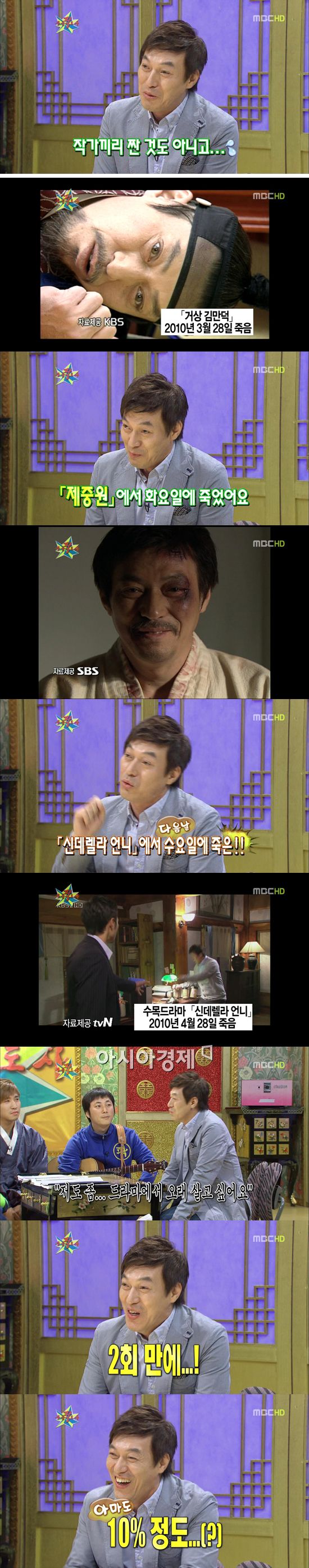 [아시아경제 최준용 기자] 강렬한 카리스마로 대표되는 배우 김갑수가 자신이 맡은 배역이 ‘단명’하는 것에 대해 언급했다.수많은 배역을 맡아 다양한 캐릭터로 변신하며 주목 받는 김갑수가 MBC '황금어장-무릎팍도사'에 출연해 드라마에서 오래 살고 싶은 속내를 밝혔다.김갑수는 “2010년 봄에 유난히 많이 죽었다”며 “‘거상김만덕’ ‘제중원’ ‘신데렐라언니’ 드라마 3개에서 연달아 죽었다”며 “특히 작가들끼리 짠 것도 아닌데 ‘제중원’은 화요일 ‘신데렐라언니’는 수요일날 연달아 죽었다”고 밝혀 웃음을 선사했다.이어 그는 “흥행에 성공한 ‘아이리스’는 출연한지 2회만에 죽었다”고 밝혀 웃음을 더했다. 죽은 다음 회상신과 영정사진으로 등장할 때 도 출연료를 다 주는지에 대한 MC의 질문에 김갑수는 “다주진 않고 회상신은 30~50% 영정사진은 10%만 준다”고 밝혔다. 이와 함께 김갑수는 “드라마 감독들도 나를 섭외 할 때 디테일 하게 언제 죽는지 알려주며 ‘한번만 도와 달라고’ 부탁한다”며 고충을 털어놨다.[MBC 방송화면 캡처]최준용 기자 yjchoi01@<ⓒ아시아경제 & 스투닷컴(stoo.com)이 만드는 온오프라인 연예뉴스>