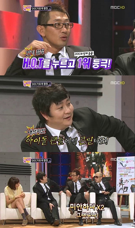 [아시아경제 고경석 기자]DJ DOC 멤버들이 음악 활동 중 가장 기뻤던 순간으로 과거 최고의 아이돌로 군림하던 H.O.T를 꺾고 1위에 등극했던 때를 꼽았다.DJ DOC의 이하늘 김창렬 정재용은 19일 오후 방송된 MBC '유재석 김원희의 놀러와'에 출연해 이같이 밝혔다.정재용은 "H.O.T가 '캔디'로 한 번씩 뜰 때마다 1만장씩 팔린다는 말이 나올 만큼 인기 있을 때 H.O.T를 누르고 1위를 했다"며 "아이돌 그룹 팬들에게 큰일이 나서 내색도 못했지만 속으로는 울었다"고 말했다. 이에 김창렬은 "미안하다는 말이 알고 보니 H.O.T 팬들에게 했던 말이었다"고 말해 스튜디오에 모인 사람들을 폭소케 했다. 한편 이날 방송에는 6년 만에 7집 앨범으로 컴백하는 DJ DOC의 세 멤버 외에도 원투의 송호범 오창훈, Ref의 성대현이 출연해 입담을 과시했다. 고경석 기자 kave@<ⓒ아시아경제 & 스투닷컴(stoo.com)이 만드는 온오프라인 연예뉴스>