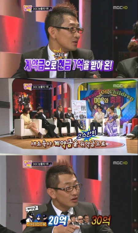 [아시아경제 고경석 기자]6년 만에 7집 앨범을 발표하는 그룹 DJ DOC가 자신들의 전성기 때 계약금으로 30억원을 받은 적이 있다고 말해 눈길을 끌었다.DJ DOC는 19일 오후 방송된 MBC 예능 프로그램 '유재석 김원희의 놀러와'에 출연해 "경제관념이 없어 돈을 모으지 못했다"는 주제로 대화를 나눴다."현금으로 30억원을 받은 적이 있다"는 이하늘의 말에 김창렬은 "예전 매니저가 있을 때 현금으로 계약금 7억원을 받은 적이 있어 하늘이 형 집에서 돈 박스를 열어 봤다"고 말했다. 김창렬은 이어 "3집 이후 새로운 소속사로 들어가던 때인데 계약관련 서류상 절차를 잘 알지 못했다"며 "그 당시 같이 있던 매니저에게 그 일을 다 맡겼다"고 설명했다.이에 이하늘은 "계약조건이 120만장 앨범 판매 후 계약 종료였는데 음반판매순위 1위에 있어도 98만장 이후 오르지 않더라. 알고 보니 집계를 멈춘 것이었다"고 당시를 떠올렸다.김창렬은 또 "믿었던 매니저가 불화를 일으켜 끝내 그 매니저와 헤어졌다"며 "당시 서태지와 아이들이 계약금으로 20억원을 받았던 때인데 우리가 30억원을 받았다"며 "하지만 수입은 0원이었다. 새 소속사와 계약하면서 받은 돈을 이전 소속사에 위약금으로 고스란히 물어줬기 때문이었다"고 회상했다.한편 이날 방송에는 6년 만에 7집 앨범으로 컴백하는 DJ DOC의 세 멤버 외에도 원투의 송호범 오창훈, Ref의 성대현이 출연해 입담을 과시했다. 고경석 기자 kave@<ⓒ아시아경제 & 스투닷컴(stoo.com)이 만드는 온오프라인 연예뉴스>